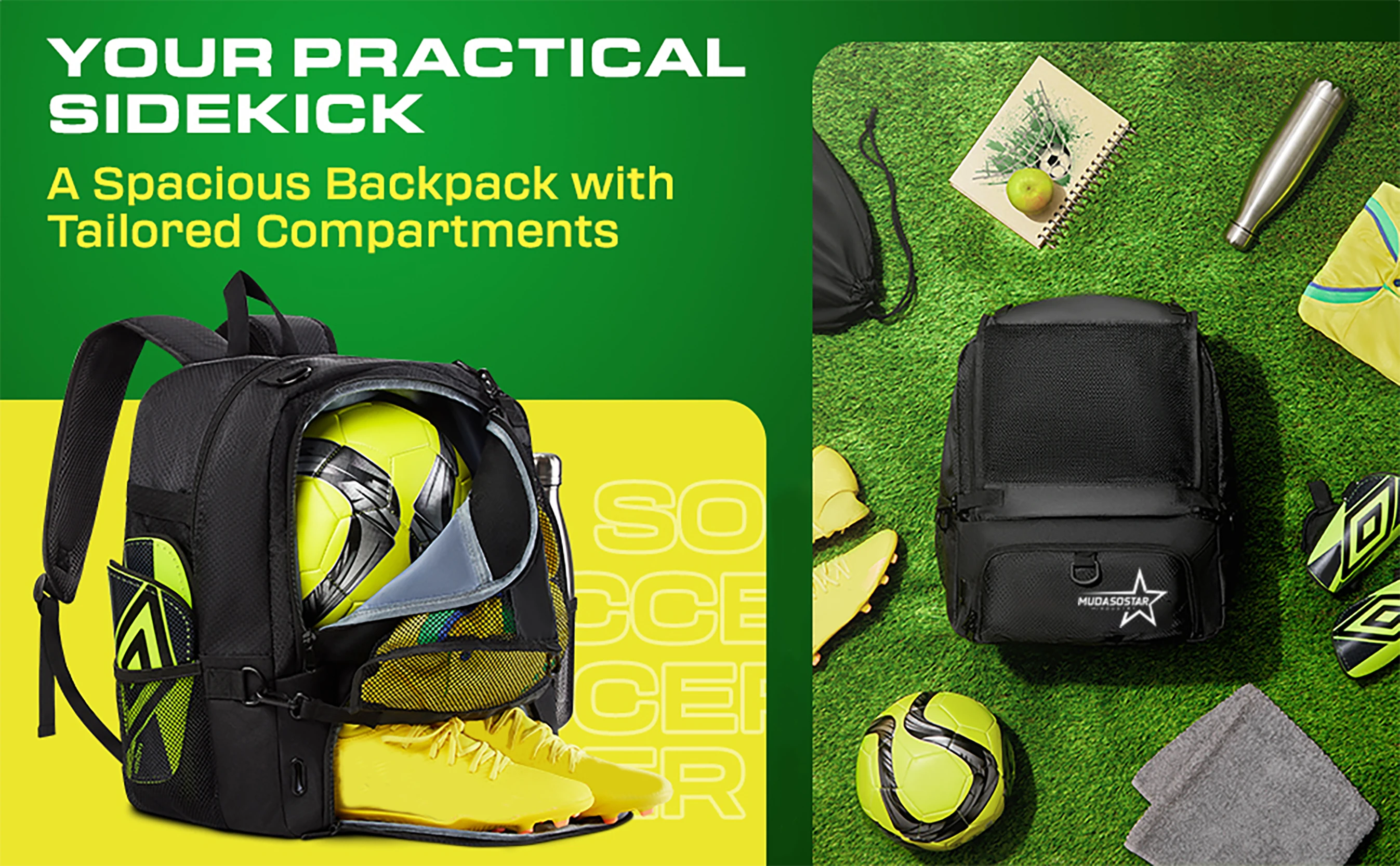Feature: | Sports Backpack For All Soccer Gear, Large main compartment, Ventilated Shoe Compartment |