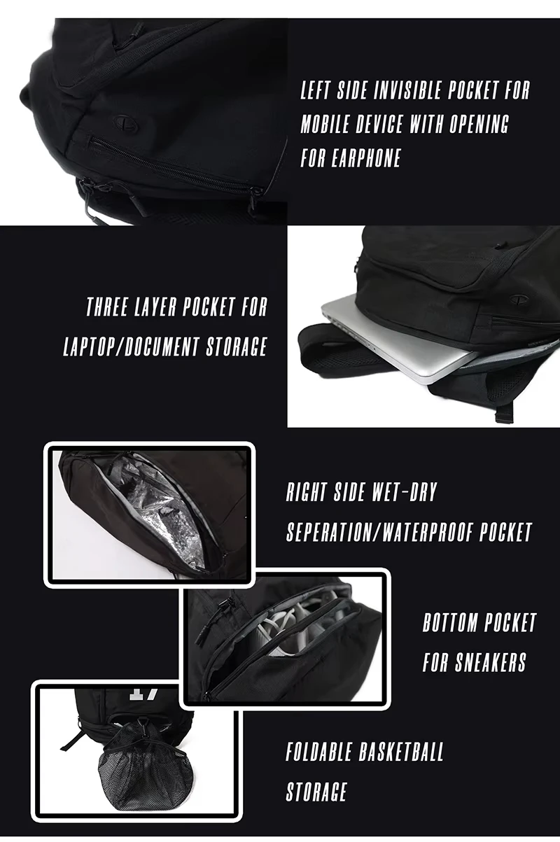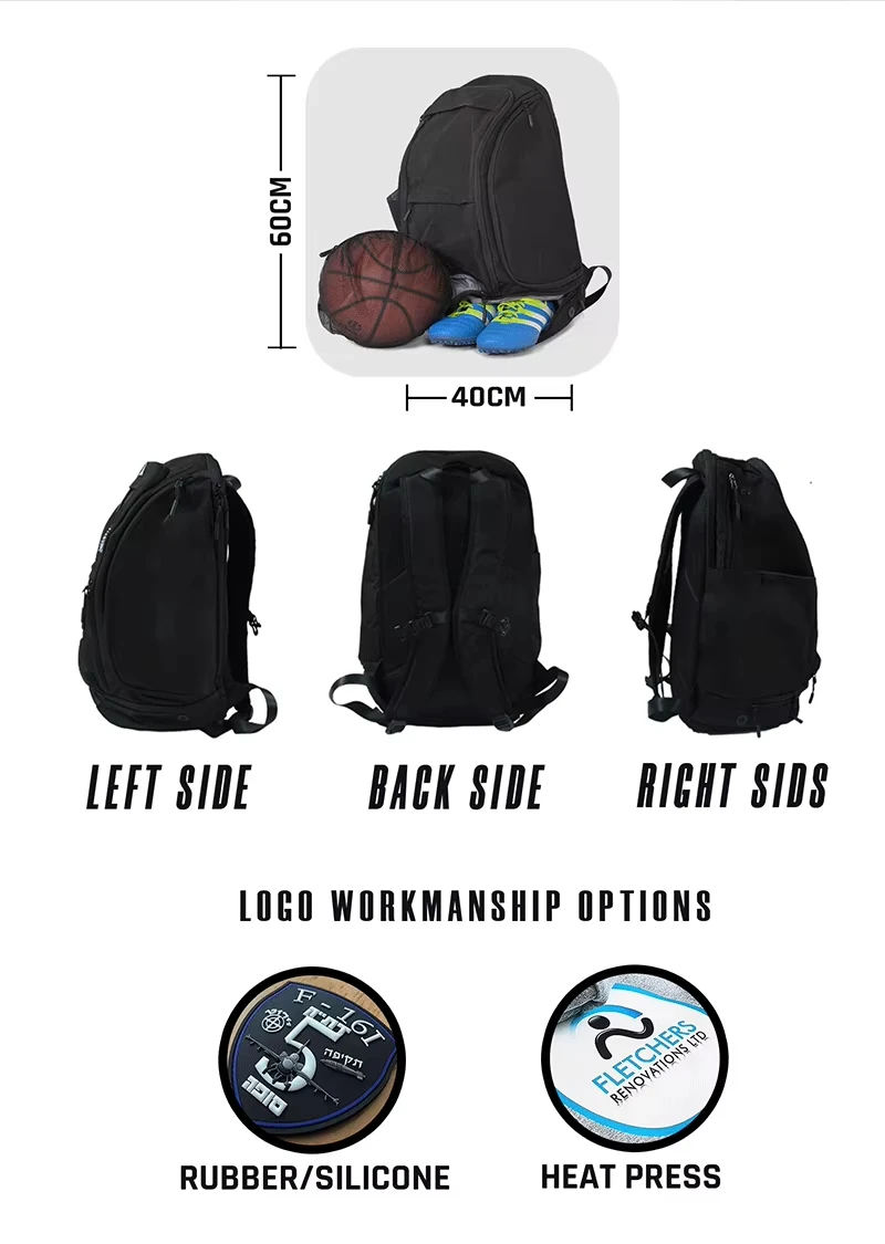 Custom Logo Men’s Soccer & Basketball Sports Backpack Waterproof Polyester Lining Black Sports Bag