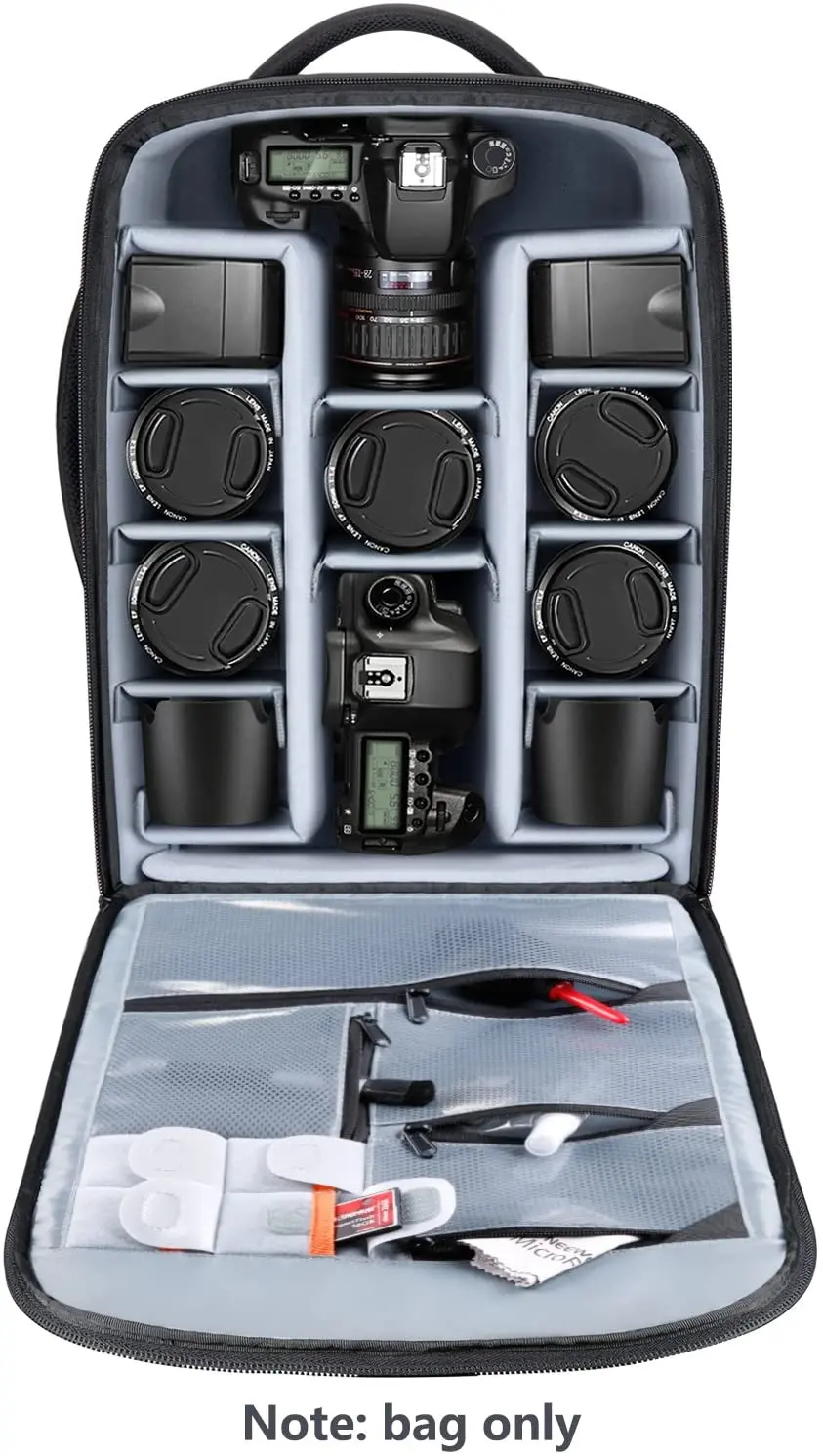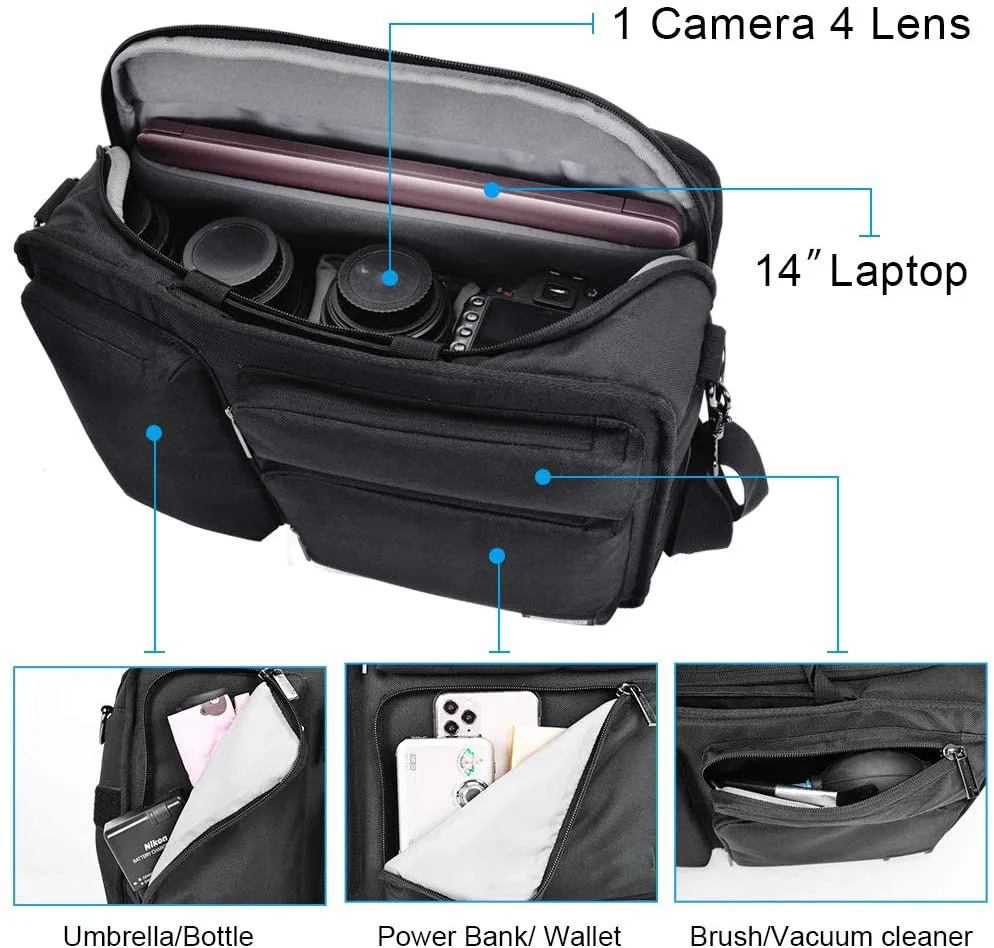 * Spacious main compartment holds one camera and multiple lenses, flashlight, and its removable dividers made of PE board and