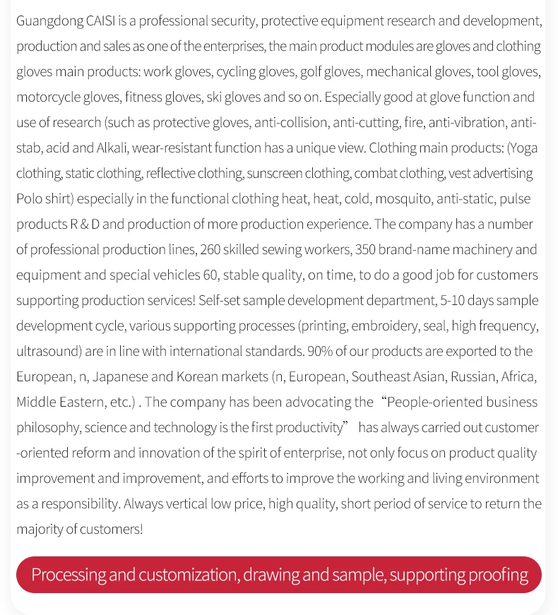 Guangdong Caisi is a professional security, protective products R & D, production, sales as one of the enterprises, the main product are gloves and clothing, gloves main products: work gloves, riding gloves, golf gloves, mechanical gloves, tool gloves, mot